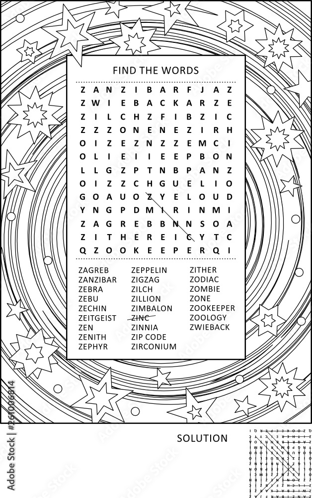 Puzzle And Coloring Activity Page For Grown Ups With Z Words Word Search Puzzle English And Wide Decorative Frame To Color Family Friendly Answer Included Stock Vector Adobe Stock